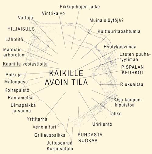 - Muidenkin yleisten alueiden säilymiseen julkisina on kiinnitettävä huomiota. Esimerkiksi polut, puistot ja ranta-alueet ovat ainakin paikoitellen saamassa yksityisalueen luonteen.