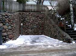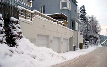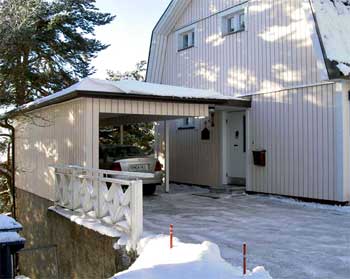 Alarinteeseen sopiva hyvä ratkaisu on rakentaa rakennuksen viereen kadun varteen pengerryksen päälle tasanne, joka toimii näköalapaikkana auton ollessa poissa (kuva 3). Tasanne voi olla myös pieni yhdelle autolle mitoitettu kadunsuuntainen tasku. Erilaiset puoliavoimet katokset eivät sovi lähiötyyppisinä Pispalaan. Katoksissa ainakin kolme sivua tulisi rakentaa umpeen. Päärakennuksen maanpäälliseen kellariin toteutettu autotalli tekee katusivusta yleensä tympeän. Umpinainen, itsenäinen autotalli tai pysäköintipaikka taivasalla ovat luontevat ratkaisut. Samoin vaikeilla tonteilla hyväksyttävä ratkaisu on betonipengerrykseen upotettu talli (kuva 5).