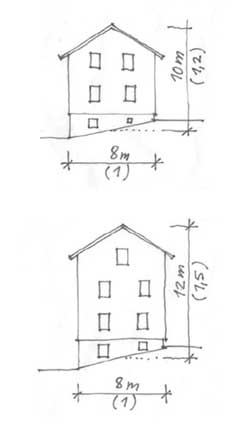Suhteiltaan hyvissä esimerkkityyppikohteissa rakennuksen runkoleveyden suhde korkeuteen on maanpinnasta harjakorkeuteen mitattuna ylärinteen puolella jopa 1:1,2, alarinteenpuolella 1:1,7.