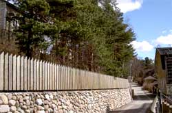 Naapuritontin rajalla on pitkänmallinen, puurakenteinen, betoniperusteinen sivurakennus, joka nojaa naapuritontin sivurakennuksen betonimuuriin. Sivurakennus ja katusivun betonipenger rajaavat pienen eteläpihan, joka avautuu komeasti Pyhäjärven maisemaan.